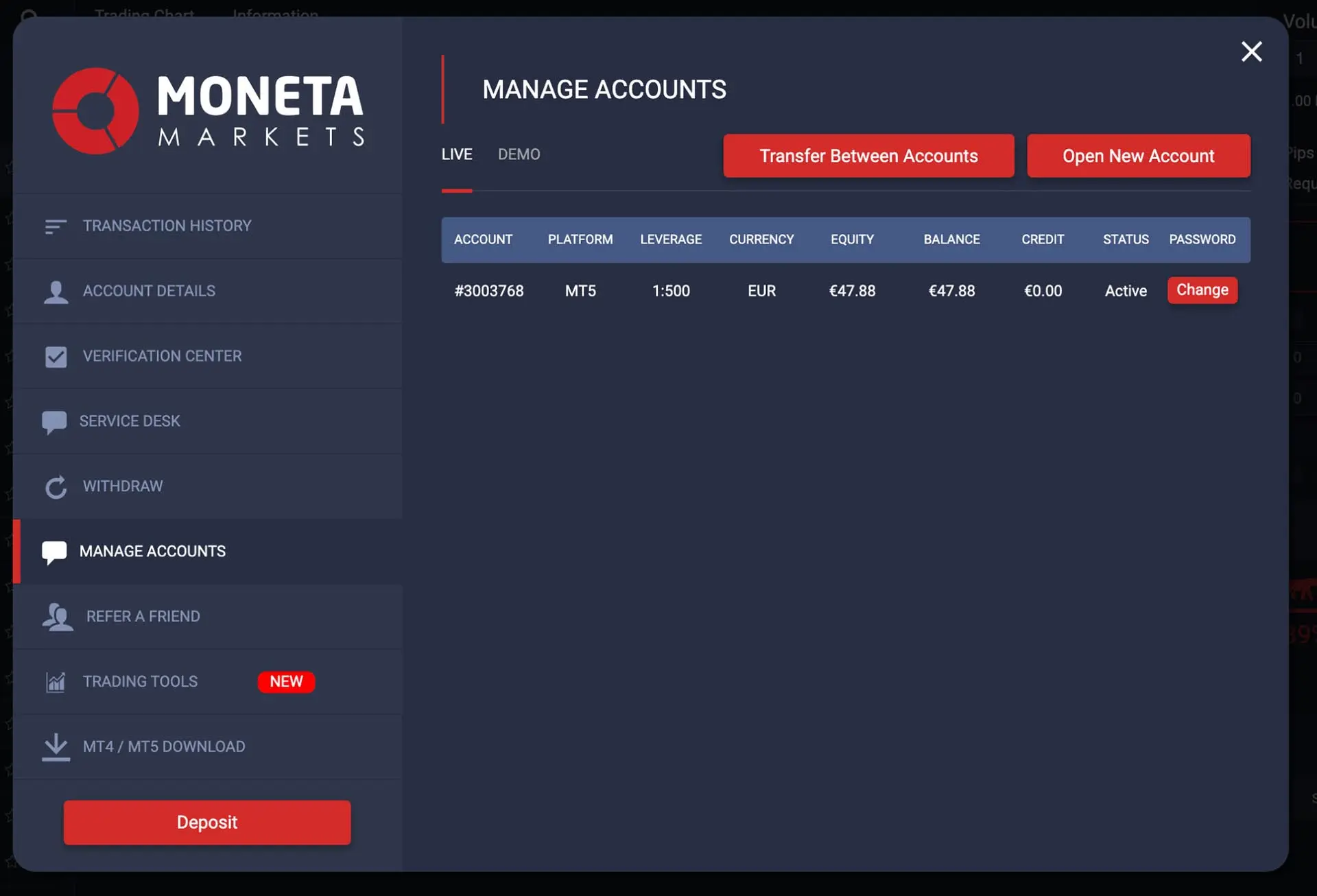 From https://myaccount.monetamarkets.com/login, select “Forgot Password” at the bottom of the login form, enter your email address, and click “Submit”. You will receive an email containing your new password shortly after.